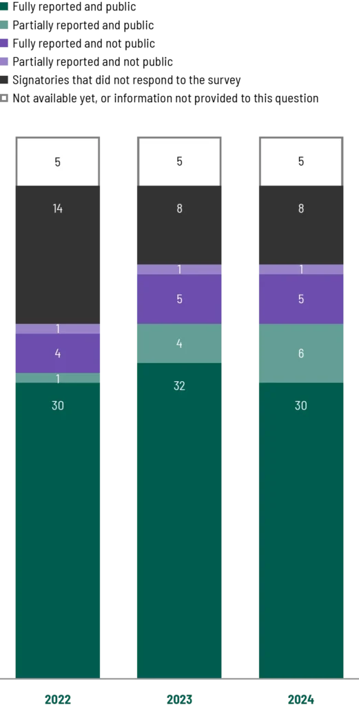 44 signatories submitted at least one year of data on their Scope 1 and 2 emissions.1 Although the overall number of reporting signatories has increased over time, the 2024 figure does not yet account for several signatories still in the process of compiling their data. These additional submissions are expected to be reflected in next year’s report.