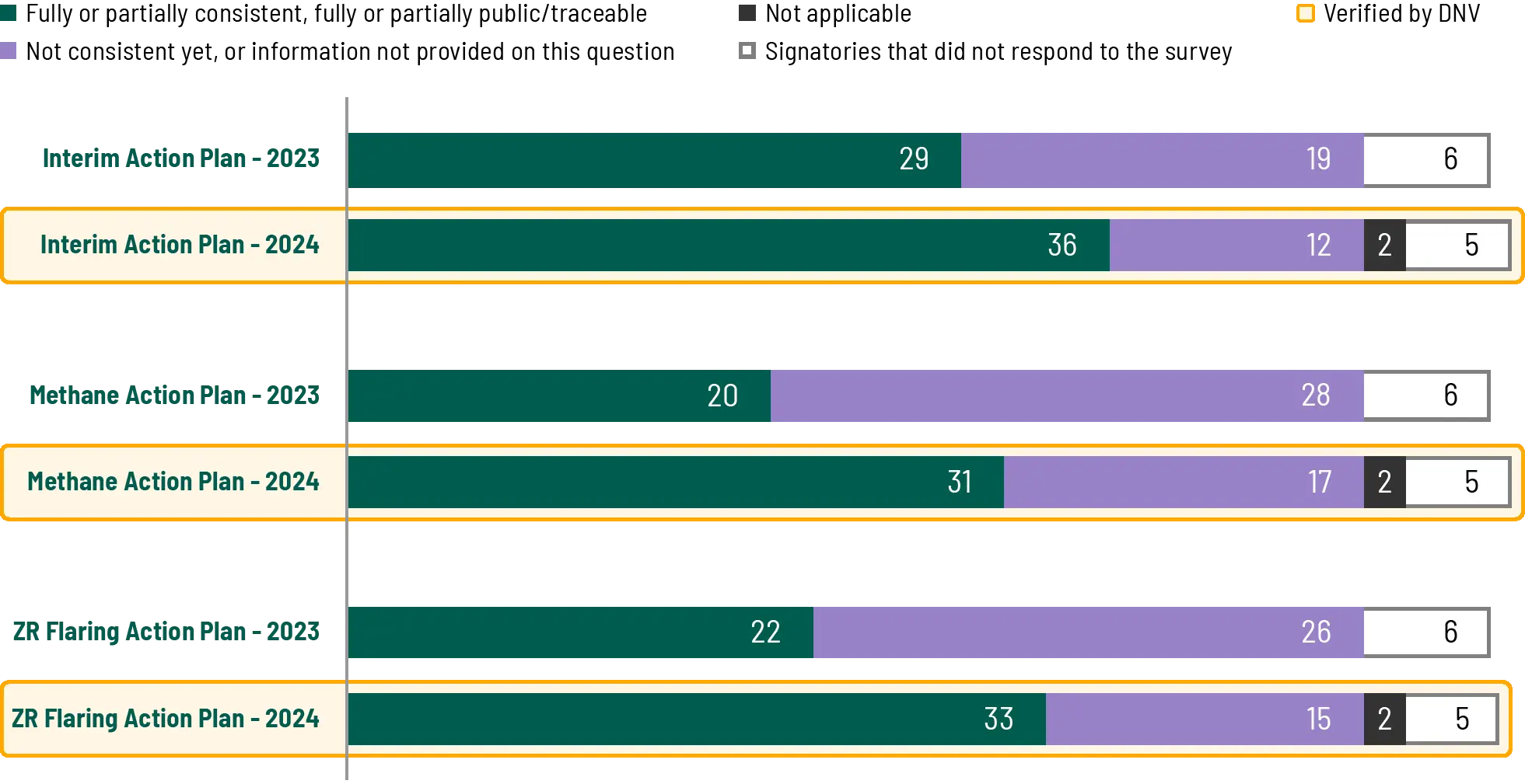 Of the 42 signatories (representing 94% of OGDC operated production) that set voluntary interim Scope 1 and 2 emissions reduction ambitions, 36 (91% of OGDC operated production) provided action plans. On near-zero methane and routine flaring, respectively, 31 signatories (86% of OGDC operated production) and 33 signatories (81% of OGDC operated production) reported action plans in 2024.