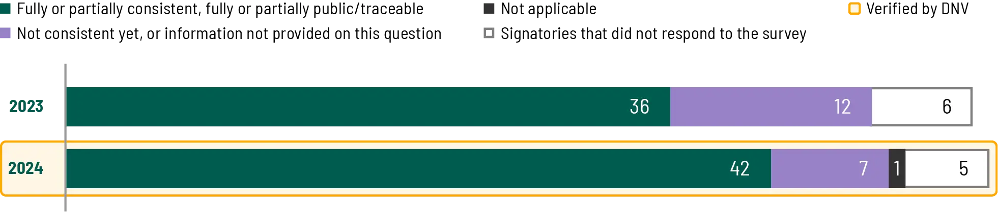 - Self-reported consistency evaluated whether a signatory declared alignment with the question asked and the Charter’s ambitions, limited to the questions within DNV’s defined scope (a detailed explanation of the verification process is provided in the Appendix).